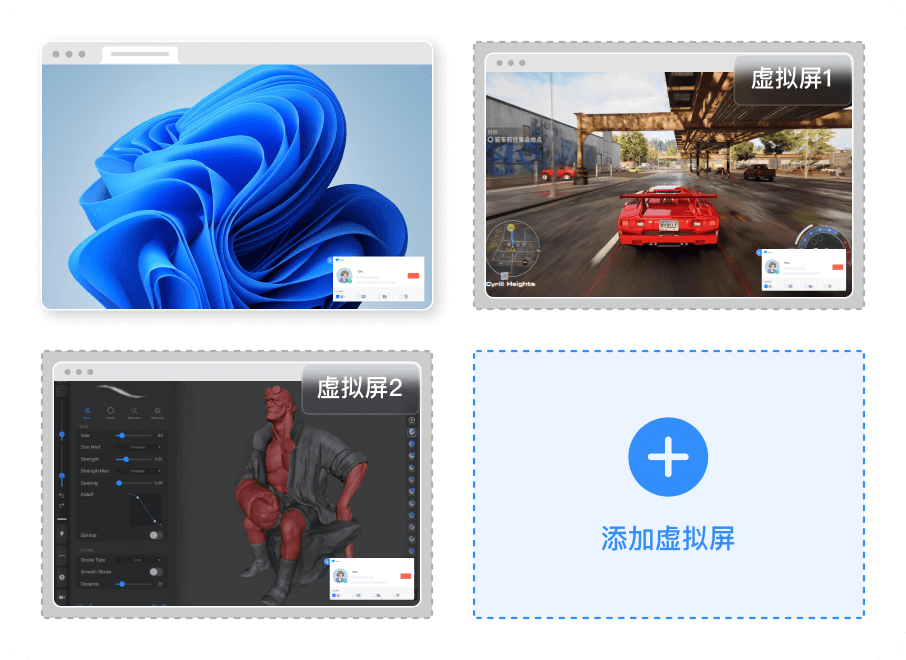 可将被控多个任务拆分到多个虚拟屏幕并分别投射到主控屏幕上。